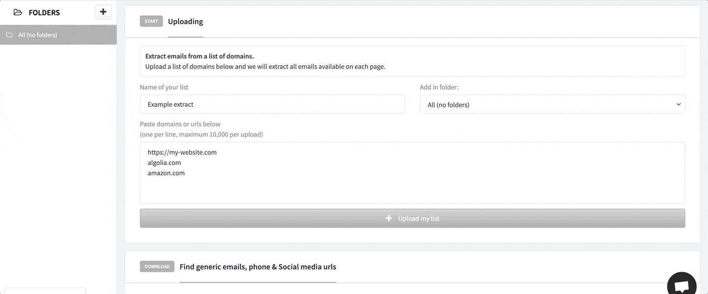 Fill in missing lead data instantly.- Upload a list of domains and get the emails